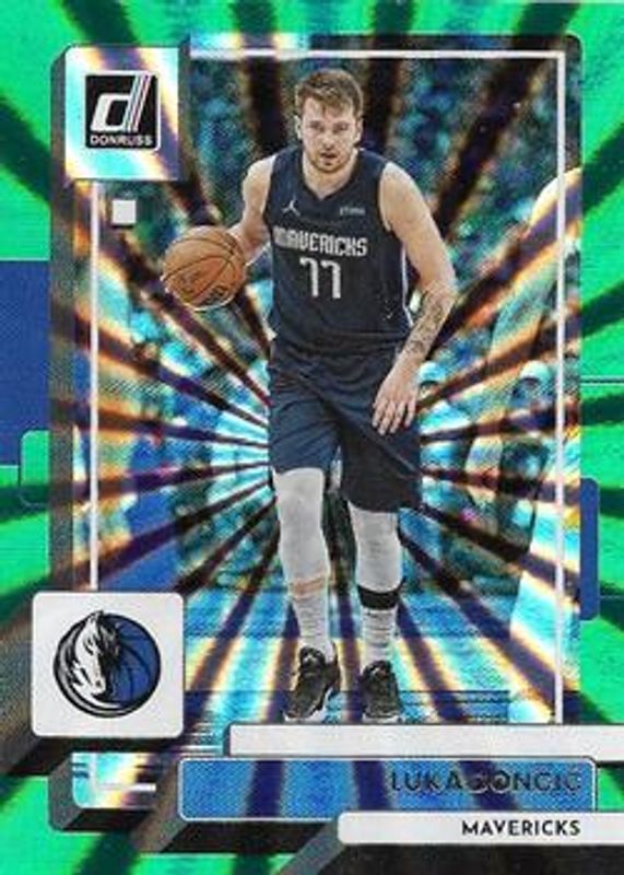 The Luka Doncic 2022 Donruss #143 Holo Green Laser card is 1 of 75 Luka Doncic's card variations in the 2022 Donruss set being tracked by Sports Card Investor, including Base, Holo Red & Gold Laser, Press Proof Silver, Yellow Flood, and Press Proof Purple /199.