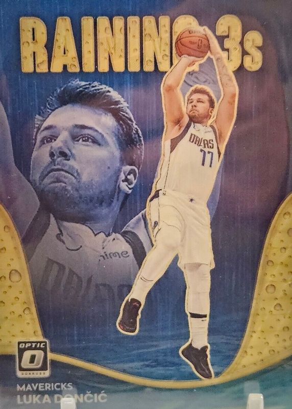 The Luka Doncic 2022 Optic #7 Raining 3s - Gold Vinyl /1 card in Raw condition has not changed in price in the last 30 days and was last sold for $1,300.00 .