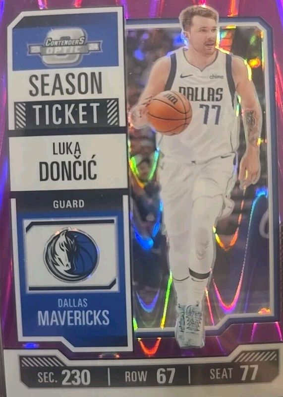 The Luka Doncic 2023 Contenders Optic #43 Season Ticket - Purple FOTL /18 card in Raw condition has not changed in price in the last 30 days and was last sold for $67.77 .