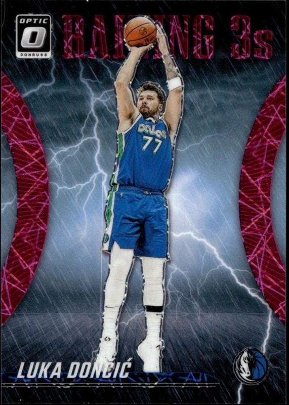 The Luka Doncic 2023 Optic #15 Raining 3s - Pink Velocity /79 card in Raw condition has not changed in price in the last 30 days and was last sold for $20.00 .