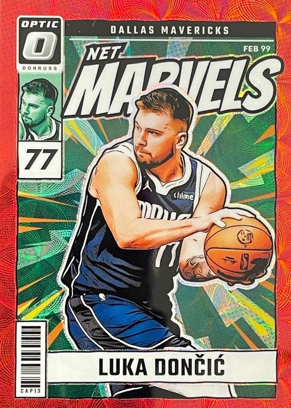The Luka Doncic 2024 Optic #17 Net Marvels - International Red card in Raw condition has moved down -$6.50 (-30.2%) in the last 30 days and was last sold for $15.00 .