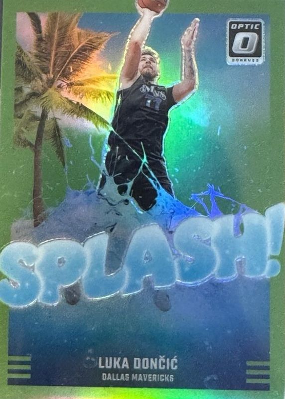 The Luka Doncic 2024 Optic #1 Splash! - Lime Green /199 card in Raw condition has moved down -$4.50 (-52.9%) in the last 30 days and was last sold for $4.00 .