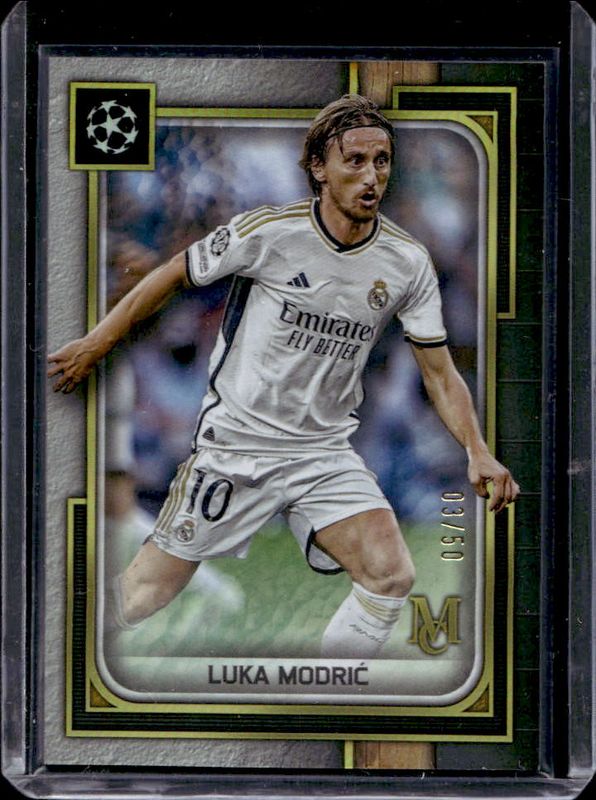 The Luka Modric 2023 Topps Museum Collection UEFA Club Competitions #56 Gold /50 card is 1 of 40 Luka Modric's card variations in the 2023 Topps Museum Collection UEFA Club Competitions set being tracked by Sports Card Investor, including Base, Amethyst /99, Sapphire /75, Ruby /25, and Black Diamond /10.