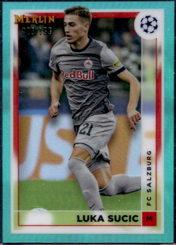 The Luka Sucic 2022 Topps Merlin Chrome UEFA Club Competitions #69 Aqua Refractor /199 Rookie card is 1 of 22 Luka Sucic's card variations in the 2022 Topps Merlin Chrome UEFA Club Competitions set being tracked by Sports Card Investor, including Base, Refractor, Vintage Merlin Refractor, Rose Gold Shimmer Refractor /299, and Pink Mojo Refractor /275.