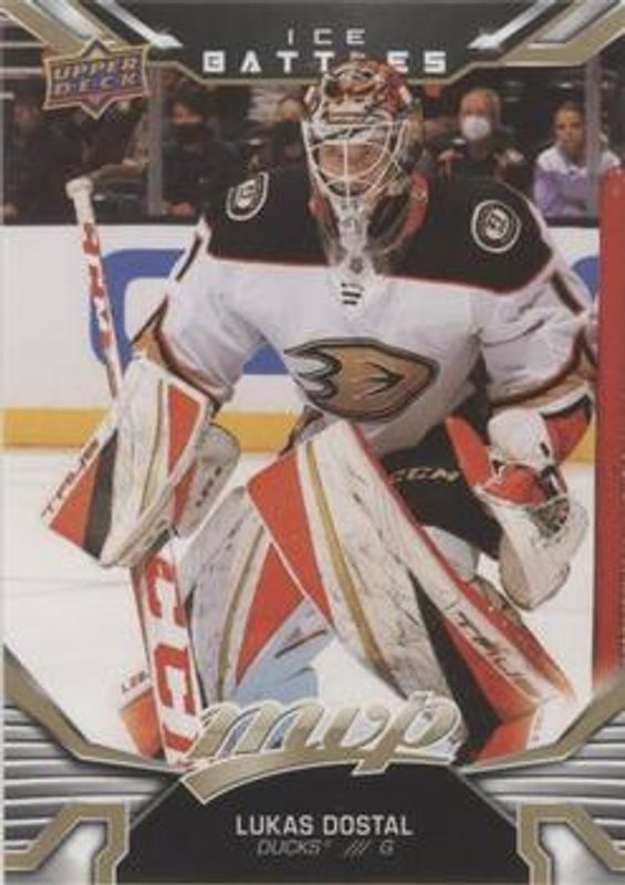 The Lukas Dostal 2022 Upper Deck MVP #227 Ice Battles - Gold Rookie card is 1 of 18 Lukas Dostal's card variations in the 2022 Upper Deck MVP set being tracked by Sports Card Investor, including Base, Blue Script, Gold Script, Ice Battles, and Silver Script.