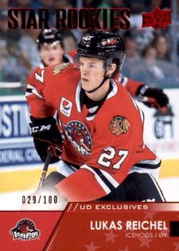 The Lukas Reichel 2021 Upper Deck AHL #120 Exclusives /100 card is 1 of 8 Lukas Reichel's card variations in the 2021 Upper Deck AHL set being tracked by Sports Card Investor, including Base, High Gloss /10, Autographs, Printing Plates - Black /1, and Printing Plates Cyan /1.