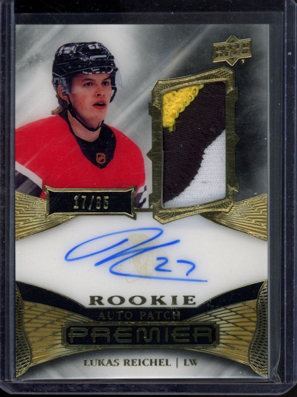The Lukas Reichel 2022 Upper Deck Premier #AR-LR Acetate Rookie Auto Patch - Gold /65 card is 1 of 39 Lukas Reichel's card variations in the 2022 Upper Deck Premier set being tracked by Sports Card Investor, including Base /399, Autographs, Jersey, Rookies Bronze /199, and Gold /65.
