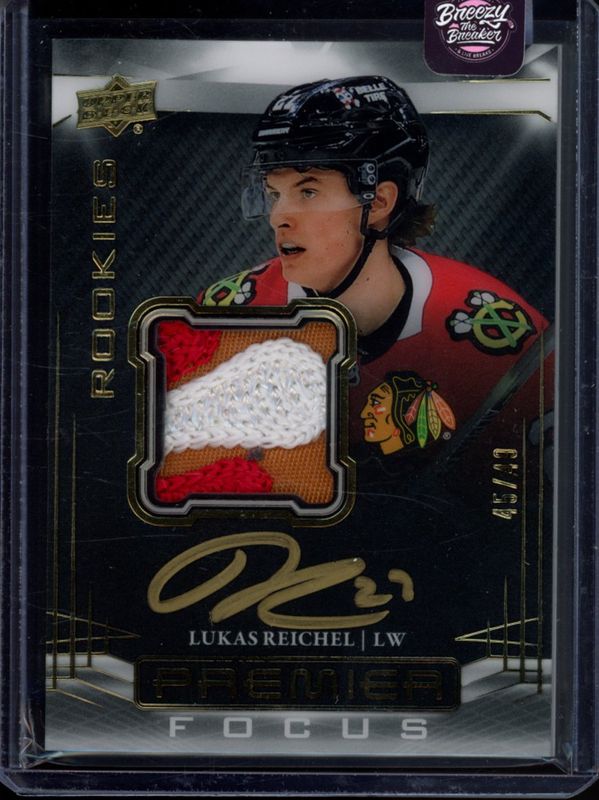 The Lukas Reichel 2022 Upper Deck Premier #PFPR-LR Premier Focus Rookies Auto Patch - Gold /49 card is 1 of 39 Lukas Reichel's card variations in the 2022 Upper Deck Premier set being tracked by Sports Card Investor, including Base /399, Autographs, Jersey, Rookies Bronze /199, and Gold /65.