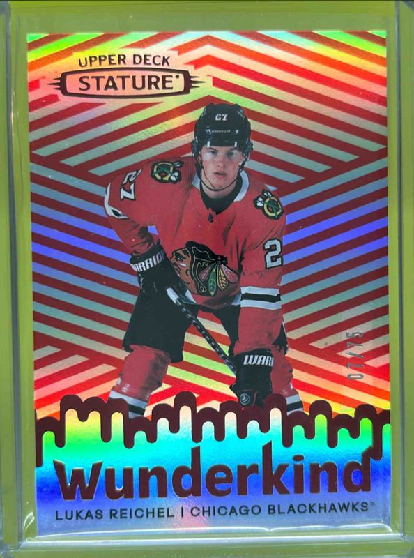 The Lukas Reichel 2022 Upper Deck Stature #W-8 Wunderkind - Red /75 Rookie card is 1 of 48 Lukas Reichel's card variations in the 2022 Upper Deck Stature set being tracked by Sports Card Investor, including Base /399, Green /99, Photo Variant /99, Red /75, and Photo Variant Green /66.