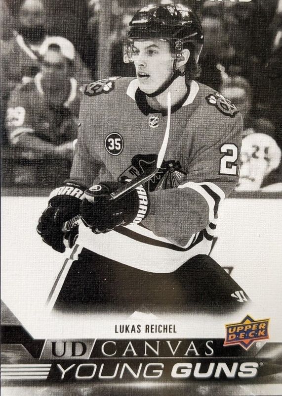 The Lukas Reichel 2022 Upper Deck #C110 Young Guns Canvas - Black & White Rookie card in Raw condition has not changed in price in the last 30 days and was last sold for $6.54 .