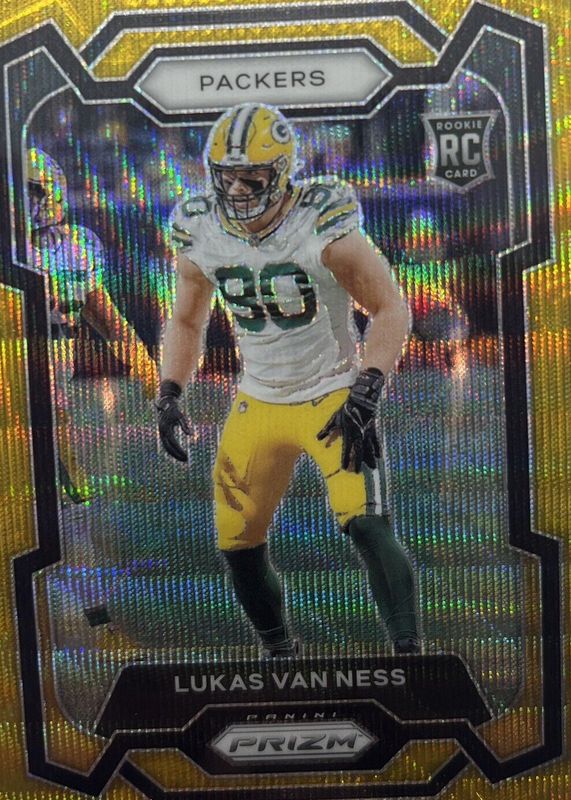 The Lukas Van Ness 2023 Prizm #336 Gold Wave /10 Rookie card in Raw condition has not changed in price in the last 30 days and was last sold for $110.00 .
