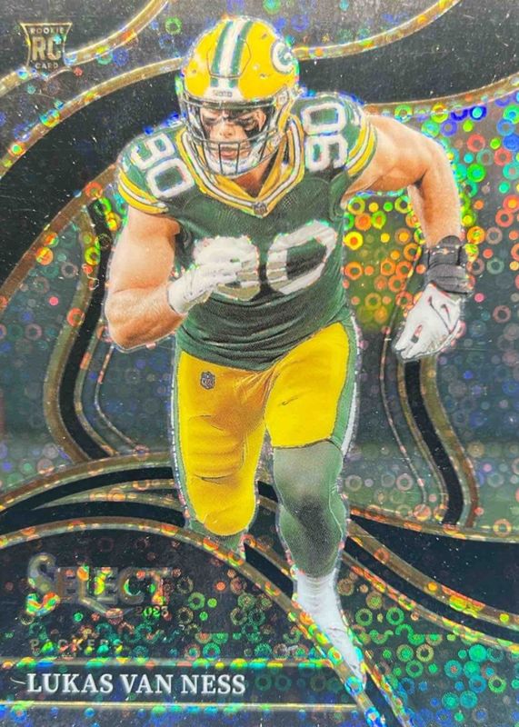 This card is 1 of 42 Lukas Van Ness' card variations in the 2023 Select set being tracked by Sports Card Investor, including Club Level, Club Level Black & Gold Die-Cut, Club Level Black & Green Die-Cut, Club Level Black & Red Die-Cut, and Club Level Disco.