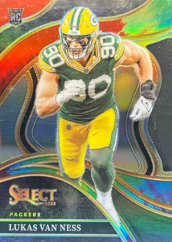 This card is 1 of 42 Lukas Van Ness' card variations in the 2023 Select set being tracked by Sports Card Investor, including Club Level, Club Level Black & Gold Die-Cut, Club Level Black & Green Die-Cut, Club Level Black & Red Die-Cut, and Club Level Disco.