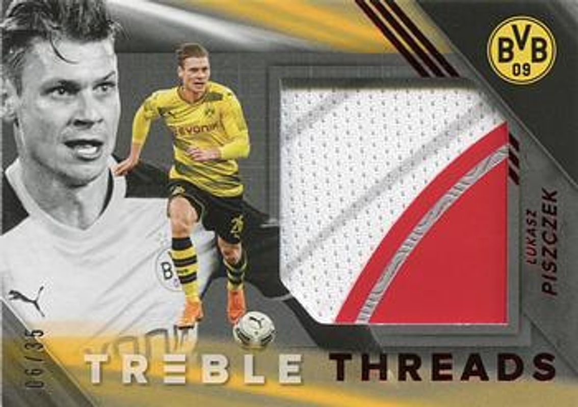 The Lukasz Piszczek 2018 Treble #TT-LPI Treble Threads Red /20 card is 1 of 25 Lukasz Piszczek's card variations in the 2018 Treble set being tracked by Sports Card Investor, including Base, Blue /75, Purple /49, Gold /25, and Green /10.