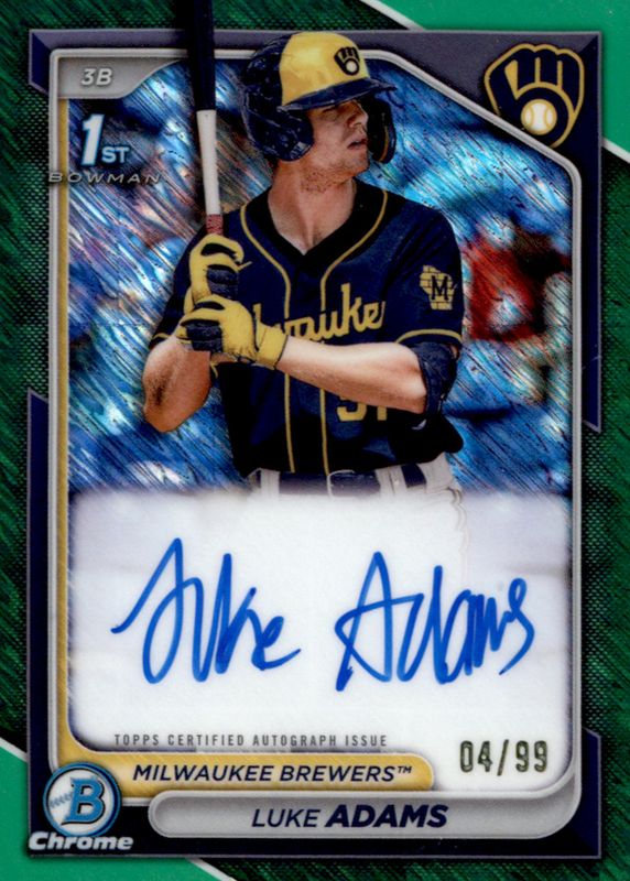 Auctions Ending Soon for Luke Adams 2024 Bowman #CPA-LA Chrome Prospect Auto - Green Shimmer Refractor /99 (1st) RAW