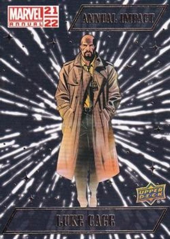 The Luke Cage 2021 Upper Deck Marvel Annual #AI-4 Annual Impact card is 1 of 17 Luke Cage's card variations in the 2021 Upper Deck Marvel Annual set being tracked by Sports Card Investor, including Base, Blue, Canvas Variant, Green, and Magenta.