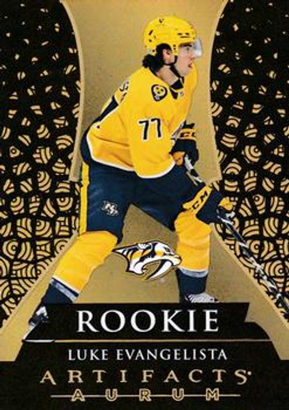 The Luke Evangelista 2023 Upper Deck Artifacts #A-35 Aurum Rookie card is 1 of 39 Luke Evangelista's card variations in the 2023 Upper Deck Artifacts set being tracked by Sports Card Investor, including Base /999, Leather, Plexi, Turquoise, and Wood.