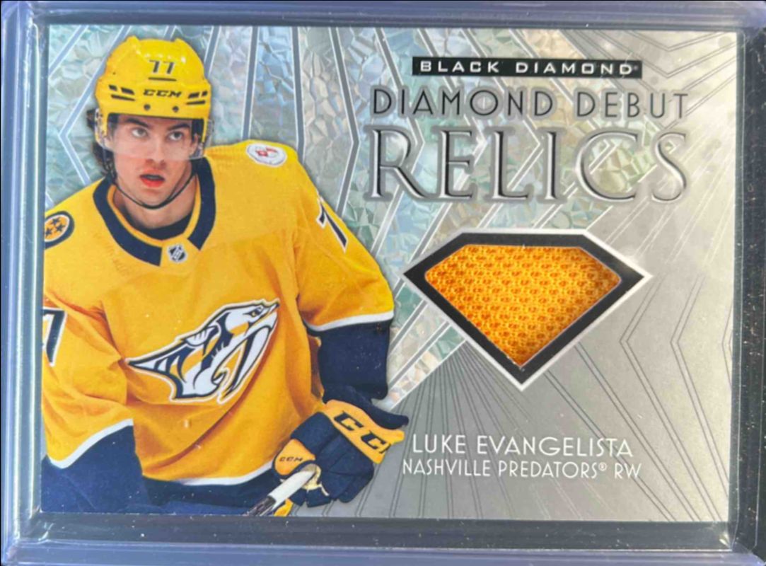 The Luke Evangelista 2023 Upper Deck Black Diamond #DD-LE Diamond Debut Relics Rookie card is 1 of 51 Luke Evangelista's card variations in the 2023 Upper Deck Black Diamond set being tracked by Sports Card Investor, including Base /349, Red /75, Blue /25, Pure Black Auto /25, and Green /10.