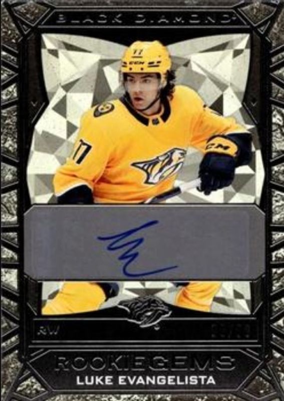 The Luke Evangelista 2023 Upper Deck Black Diamond #RG-LE Rookie Gems Signatures /99 card is 1 of 51 Luke Evangelista's card variations in the 2023 Upper Deck Black Diamond set being tracked by Sports Card Investor, including Base /349, Red /75, Blue /25, Pure Black Auto /25, and Green /10.