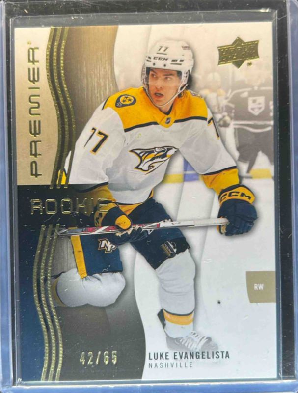 The Luke Evangelista 2023 Upper Deck Premier #112 Gold /65 Rookie card is 1 of 24 Luke Evangelista's card variations in the 2023 Upper Deck Premier set being tracked by Sports Card Investor, including Base /399, Bronze /199, Ruby /49, Rose Gold /25, and Fight Strap /15.