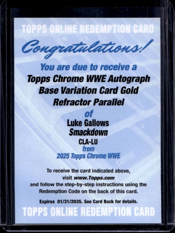 The Luke Gallows 2025 Topps Chrome WWE #CLA-LU Autographs - Gold Refractor /50 card is 1 of 50 Luke Gallows' card variations in the 2025 Topps Chrome WWE set being tracked by Sports Card Investor, including Base, Black & Gold Refractor, Geometric Refractor, Neon Green & Black Refractor, and Pink Shimmer Refractor.