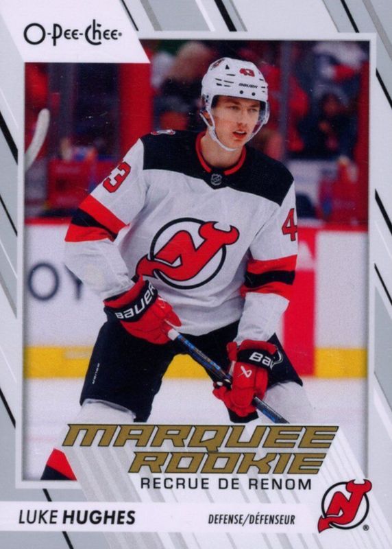 This card is 1 of 16 Luke Hughes' card variations in the 2023 O-Pee-Chee set being tracked by Sports Card Investor, including Marquee Rookies - Blue Border, Marquee Rookies - Portrait Photo Variation, Marquee Rookies - Pregame Warm-Up Jersey Photo Variation, Marquee Rookies - Red Border, and Marquee Rookies - Retro.