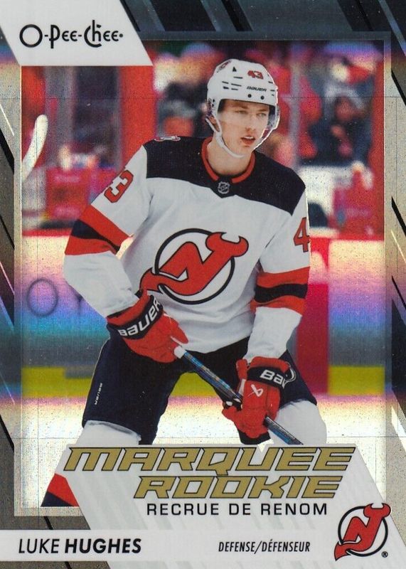 This card is 1 of 16 Luke Hughes' card variations in the 2023 O-Pee-Chee set being tracked by Sports Card Investor, including Marquee Rookies, Marquee Rookies - Blue Border, Marquee Rookies - Portrait Photo Variation, Marquee Rookies - Pregame Warm-Up Jersey Photo Variation, and Marquee Rookies - Red Border.
