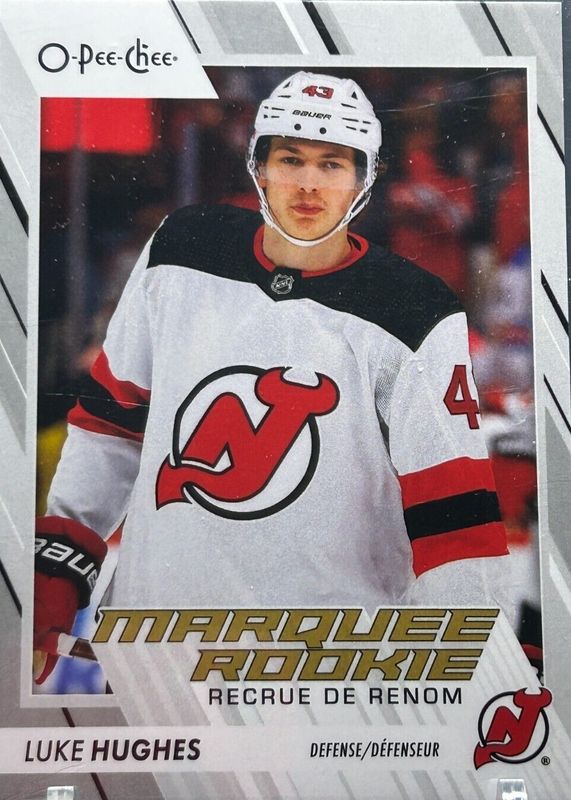 This card is 1 of 16 Luke Hughes' card variations in the 2023 O-Pee-Chee set being tracked by Sports Card Investor, including Marquee Rookies, Marquee Rookies - Blue Border, Marquee Rookies - Pregame Warm-Up Jersey Photo Variation, Marquee Rookies - Red Border, and Marquee Rookies - Retro.