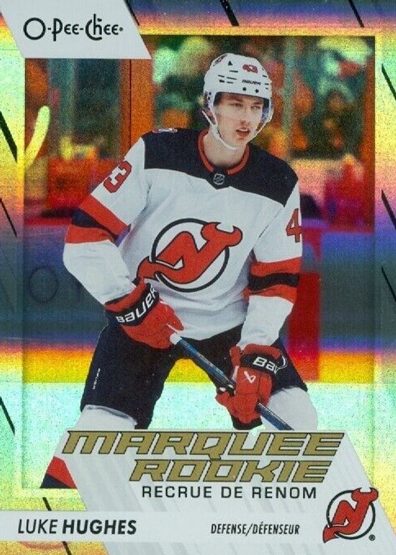 This card is 1 of 16 Luke Hughes' card variations in the 2023 O-Pee-Chee set being tracked by Sports Card Investor, including Marquee Rookies, Marquee Rookies - Blue Border, Marquee Rookies - Portrait Photo Variation, Marquee Rookies - Pregame Warm-Up Jersey Photo Variation, and Marquee Rookies - Red Border.