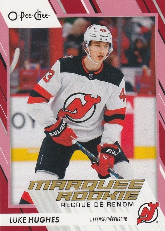 This card is 1 of 16 Luke Hughes' card variations in the 2023 O-Pee-Chee set being tracked by Sports Card Investor, including Marquee Rookies, Marquee Rookies - Blue Border, Marquee Rookies - Portrait Photo Variation, Marquee Rookies - Pregame Warm-Up Jersey Photo Variation, and Marquee Rookies - Retro.