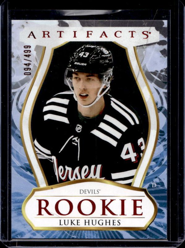 The Luke Hughes 2023 Upper Deck Artifacts #192 Ruby /499 Rookie card is 1 of 26 Luke Hughes' card variations in the 2023 Upper Deck Artifacts set being tracked by Sports Card Investor, including Base /999, Leather, Plexi, Turquoise, and Wood.