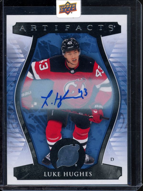 The Luke Hughes 2023 Upper Deck Artifacts #TTR-LH Top Tier Rookie Signatures card is 1 of 26 Luke Hughes' card variations in the 2023 Upper Deck Artifacts set being tracked by Sports Card Investor, including Base /999, Leather, Plexi, Turquoise, and Wood.