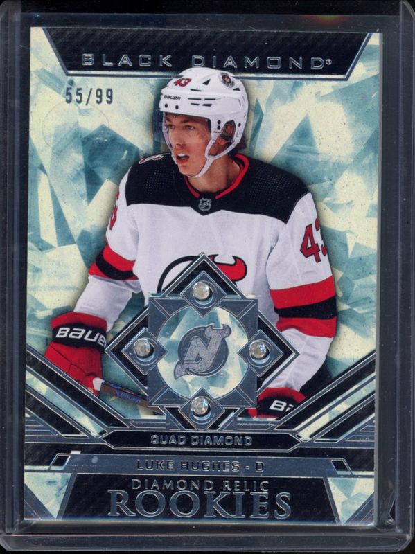 The Luke Hughes 2023 Upper Deck Black Diamond #BDR-LH Diamond Relic Rookies /99 card is 1 of 72 Luke Hughes' card variations in the 2023 Upper Deck Black Diamond set being tracked by Sports Card Investor, including Base /349, Red /75, Blue /25, Pure Black Auto /25, and Green /10.