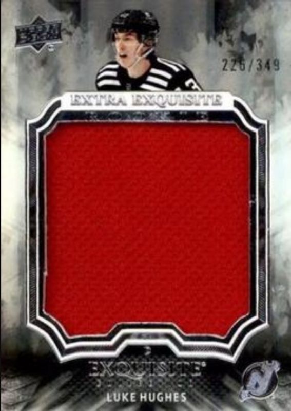 The Luke Hughes 2023 Upper Deck Black Diamond #ECER-LH Exquisite Collection Extra Exquisite Rookies /349 card is 1 of 72 Luke Hughes' card variations in the 2023 Upper Deck Black Diamond set being tracked by Sports Card Investor, including Base /349, Red /75, Blue /25, Pure Black Auto /25, and Green /10.