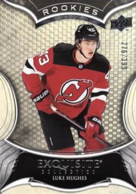 The Luke Hughes 2023 Upper Deck Black Diamond #R-LH Exquisite Collection Rookies /399 card is 1 of 72 Luke Hughes' card variations in the 2023 Upper Deck Black Diamond set being tracked by Sports Card Investor, including Base /349, Red /75, Blue /25, Pure Black Auto /25, and Green /10.