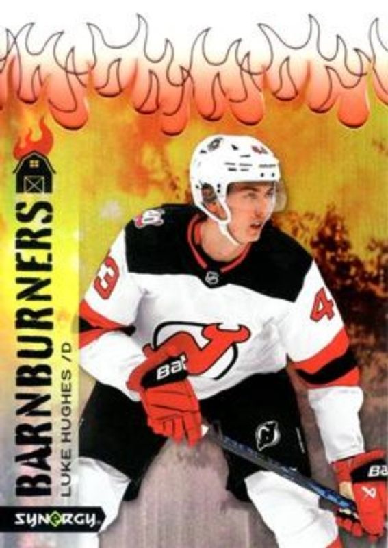 The Luke Hughes 2023 Upper Deck Synergy #BARN-2 Barnburners! Rookie card is 1 of 44 Luke Hughes' card variations in the 2023 Upper Deck Synergy set being tracked by Sports Card Investor, including Base /24, Red, Red Codes, Purple /99, and Gold /25.