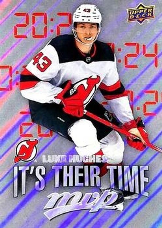 The Luke Hughes 2024 Upper Deck MVP #IT-18 It's Their Time card is 1 of 13 Luke Hughes' card variations in the 2024 Upper Deck MVP set being tracked by Sports Card Investor, including Base, Gold Script, Silver Script, Super Script /25, and Printing Plates Black /1.