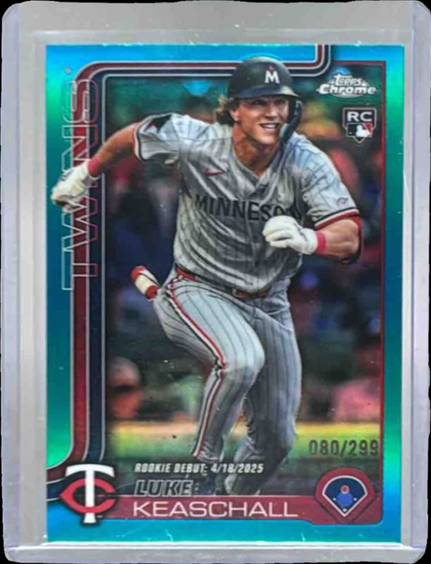 The Luke Keaschall 2025 Topps Chrome Update #USC134 Teal Refractor /299 Rookie card is 1 of 196 Luke Keaschall's card variations in the 2025 Topps Chrome Update set being tracked by Sports Card Investor, including #USC134 Base, #USC106 Base, #USC106 Image Variation, #USC134 Rookie Debut, and #USC134 Geometric Refractor.