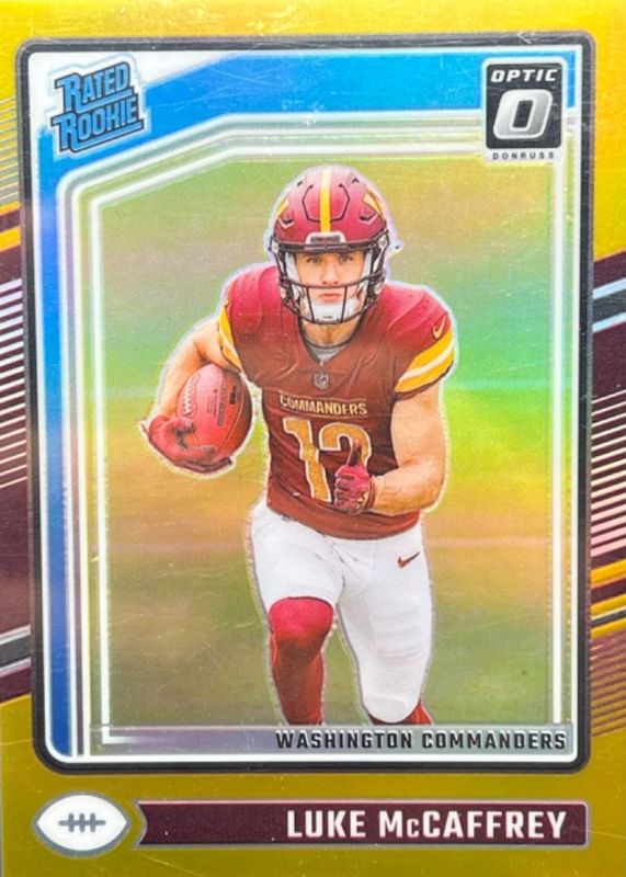 The Luke McCaffrey 2024 Optic #268 Gold /10 Rookie card in Raw condition has not changed in price in the last 30 days and was last sold for $83.00 .