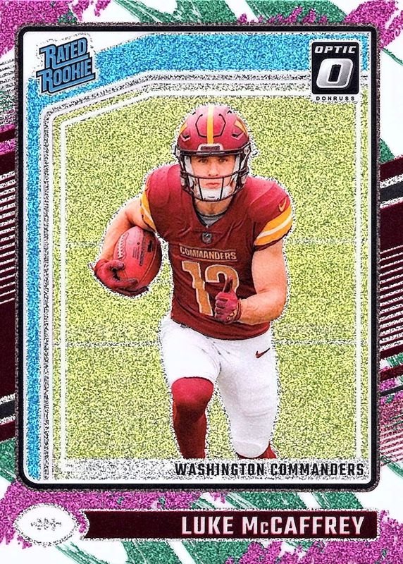 This card is 1 of 58 Luke McCaffrey's card variations in the 2024 Optic set being tracked by Sports Card Investor, including Base, Blue Hyper, Blue Scope, Green Hyper, and Green Velocity.