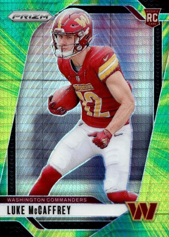 This card is 1 of 129 Luke McCaffrey's card variations in the 2024 Prizm set being tracked by Sports Card Investor, including Base, Choice Blue Yellow Green, Choice Silver, Disco, and Green.