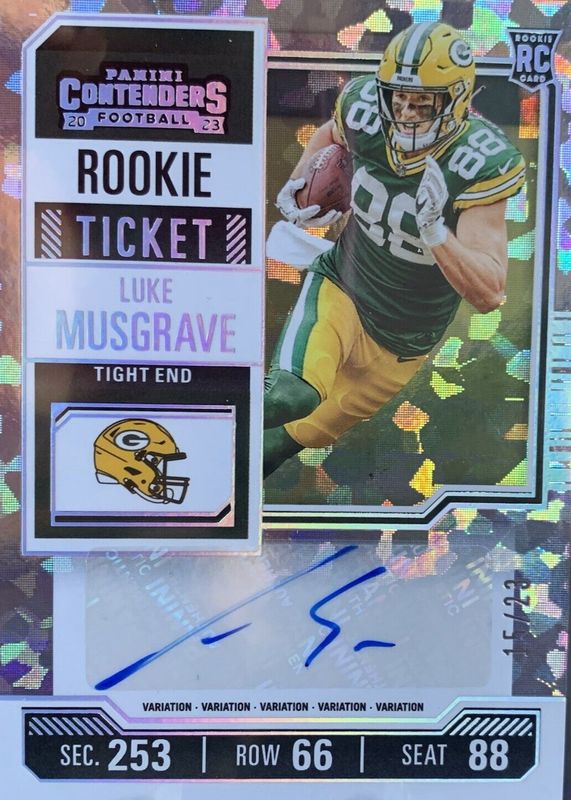 This card is 1 of 23 Luke Musgrave's card variations in the 2023 Contenders set being tracked by Sports Card Investor, including Rookie Ticket Auto, Rookie Ticket Auto - Opening Kickoff Ticket, Rookie Ticket Auto - Red Zone Ticket, Rookie Ticket Auto - Ticket Stub (/88), and Rookie Ticket Auto Variation.