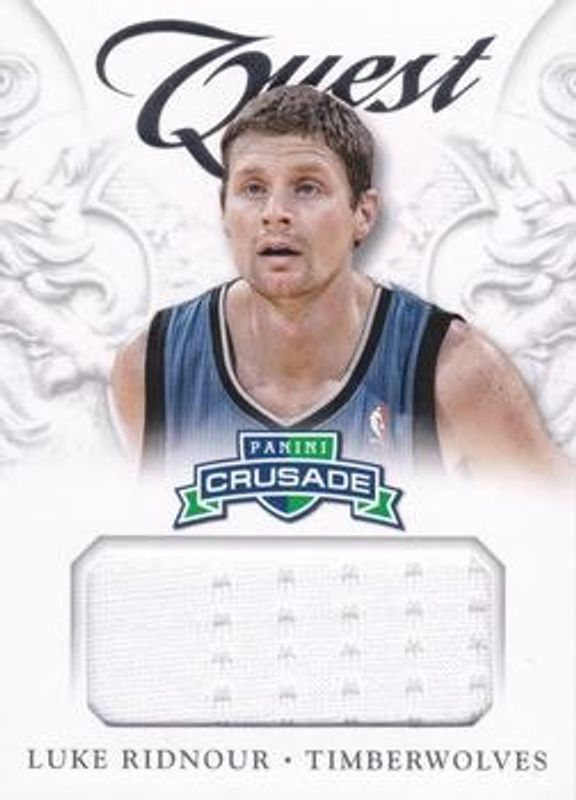 The Luke Ridnour 2012 Crusade #13 Quest Memorabilia card is 1 of 2 Luke Ridnour's card variations in the 2012 Crusade set being tracked by Sports Card Investor, including Quest Memorabilia - Prime /25.