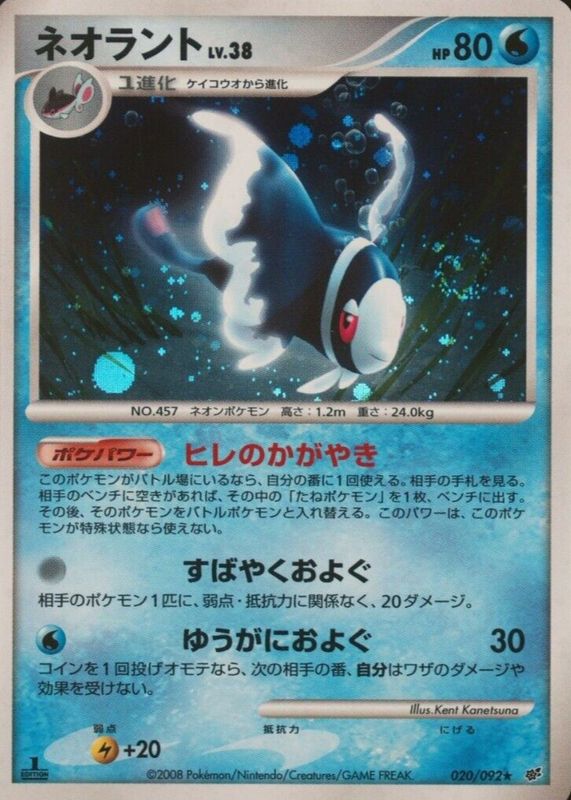 The Lumineon 2008 Japanese Diamond & Pearl: Intense Fight in the Destroyed Sky #020/092 1st Edition Holo card in Raw TCG (Near Mint) condition has not changed in price in the last 30 days and was last sold for $3.25 .