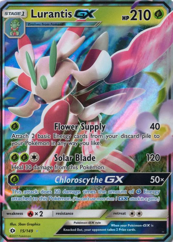 The Lurantis GX 2017 Sun & Moon #015/149 Holo card in Raw TCG (Near Mint) condition has moved up $0.33 (+16.3%) in the last 30 days and was last sold for $2.33 .