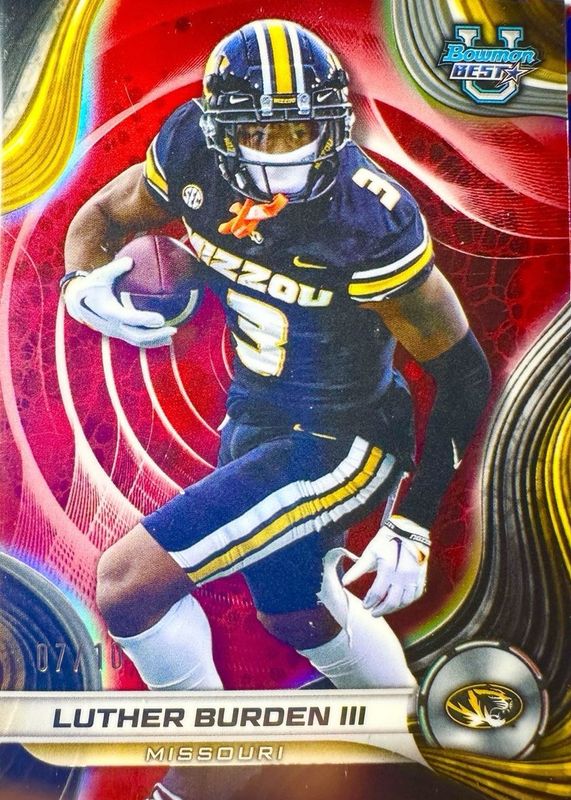 This card is 1 of 35 Luther Burden III's card variations in the 2024 Bowman Best University set being tracked by Sports Card Investor, including Base, Refractor, Speckle Refractor, Aqua Refractor /225, and Blue Refractor /149.