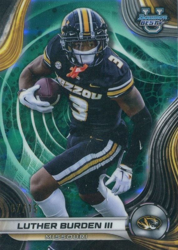 This card is 1 of 35 Luther Burden III's card variations in the 2024 Bowman Best University set being tracked by Sports Card Investor, including Base, Refractor, Speckle Refractor, Aqua Refractor /225, and Blue Refractor /149.
