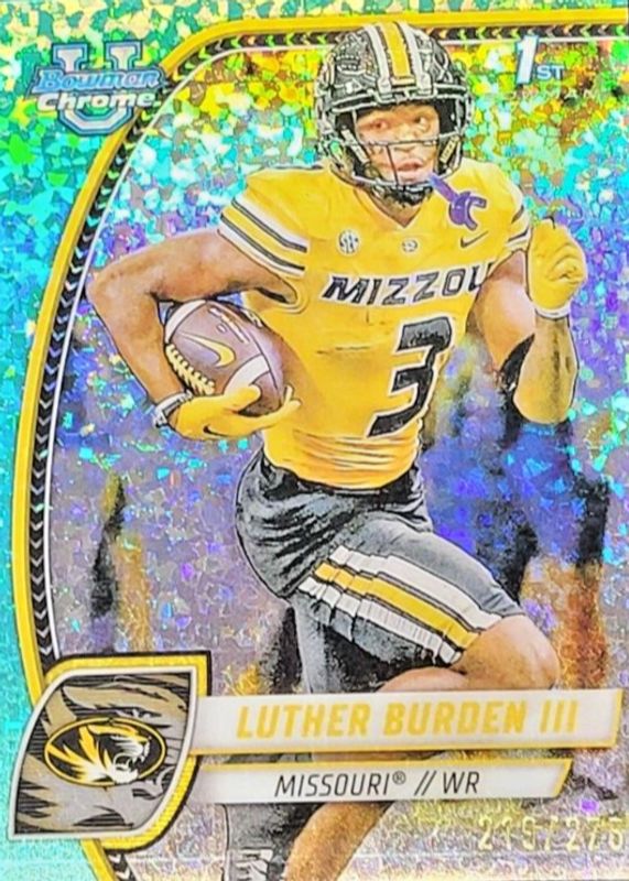 The Luther Burden III 2024 Bowman Chrome University #123 Aqua Mini-Diamond Refractor /275 (1st) card in Raw condition has moved up $1.75 (+53.8%) in the last 30 days and was last sold for $5.00 .