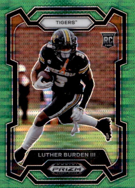 The Luther Burden III 2024 Prizm Draft Picks #198 Green Pulsar /25 card in Raw condition has not changed in price in the last 30 days and was last sold for $18.99 .