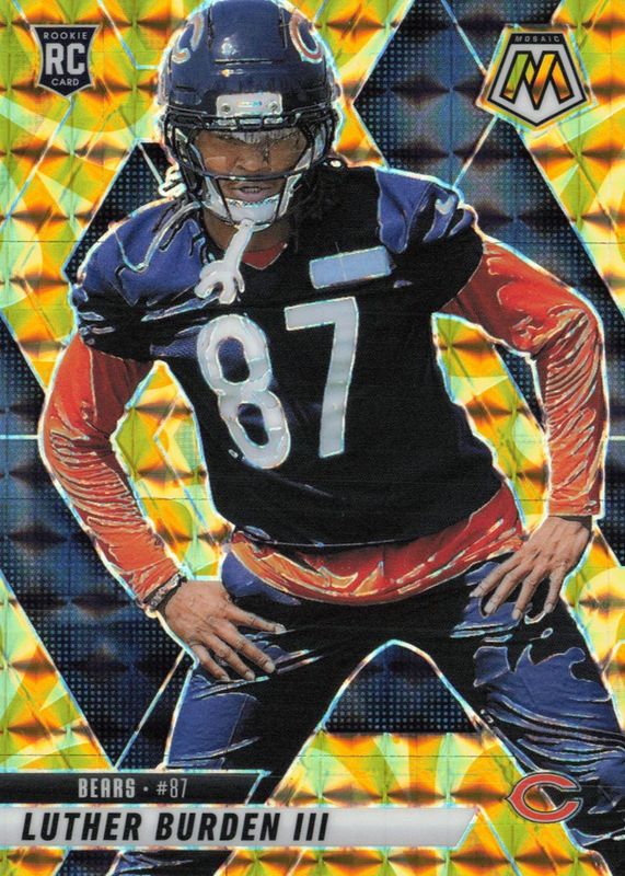 The Luther Burden III 2025 Mosaic #383 Reactive Yellow Rookie card in Raw condition has moved down -$0.50 (-25.0%) in the last 30 days and was last sold for $1.50 .